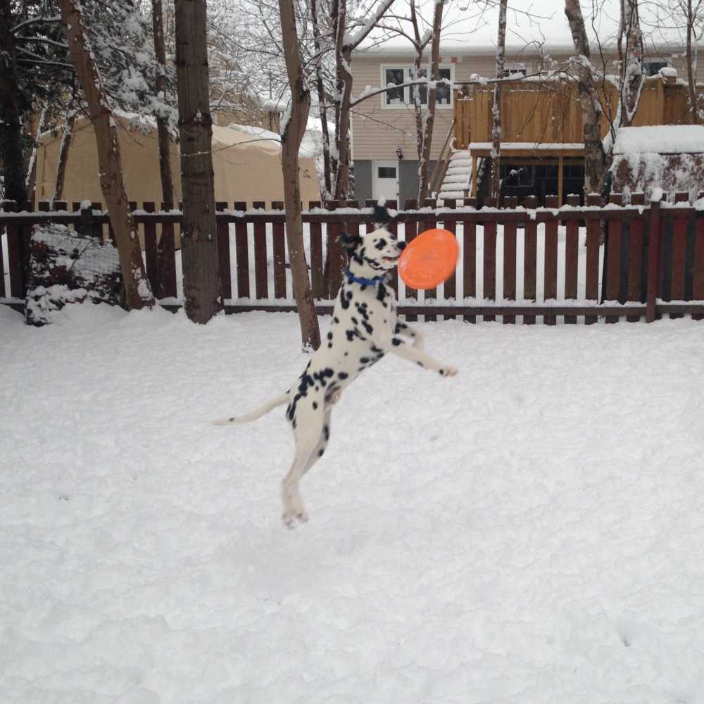 Our brag is not a title but an overall thank you to Sara and the Flying Disc class that I took this last summer. I have three Dalmatians and after the class I started to work with all three dogs. I just wanted to brag because of all the classes that I have taken at Fenzi, this one has had the most carry over to all my dogs. They have become disc crazy. It is wonderful that the snow has come to give us lots of clean play. Here is a picture of Baloo in the back yard today in the snow...